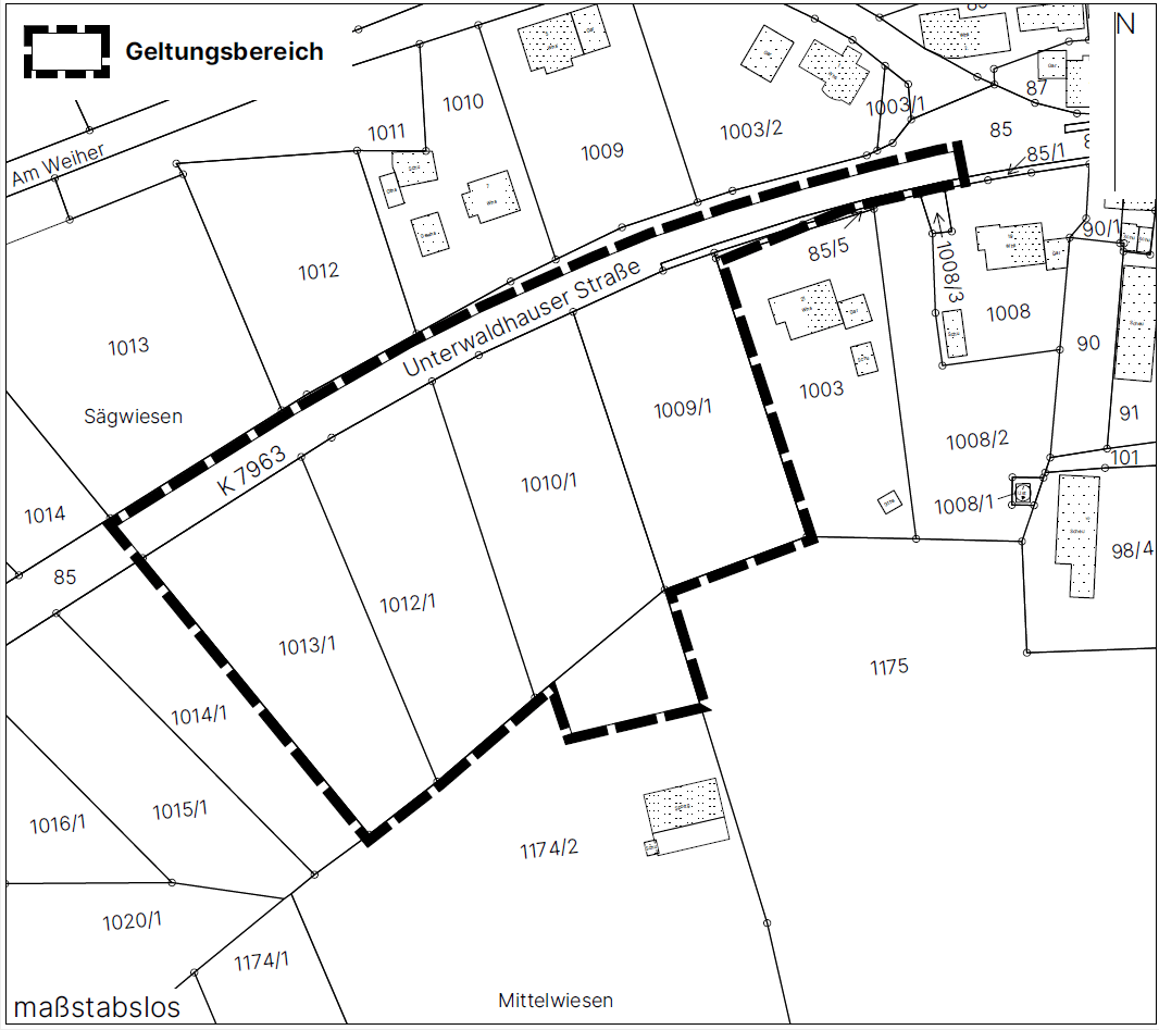 Das Plangebiet liegt am westlichen Rand des Hauptortes Ebenweiler, süd-lich der „Unterwaldhauser Straße“ (K 7963) sowie nördlich der bestehenden Sportplatzflächen und umfasst folgende Grundstücke: Flst.-Nrn. 85 (Teilfläche), 1009/1, 1010/1, 1012/1, 1013/1 und 1174/2 (Teilfläche). Der räumliche Geltungsbereich ist im abgebildeten Lageplan dargestellt.